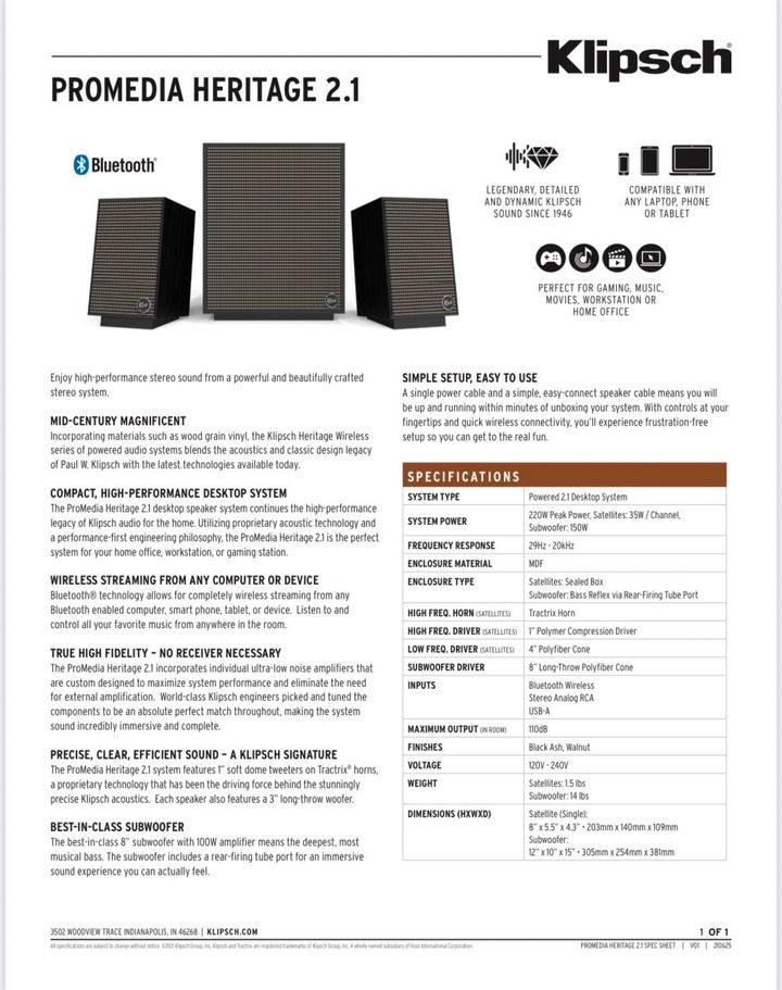รหัสสินค้า | Klipsch ProMedia Heritage 2.1 |